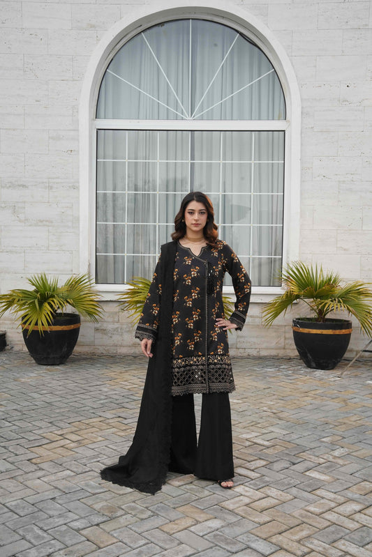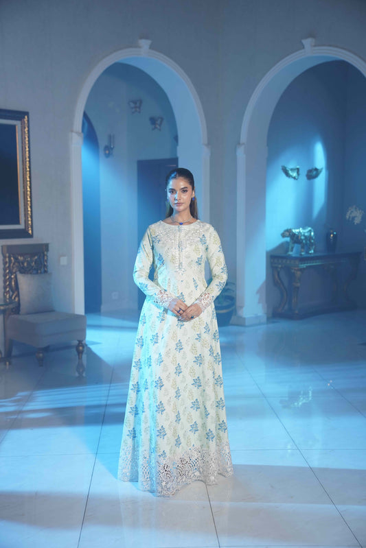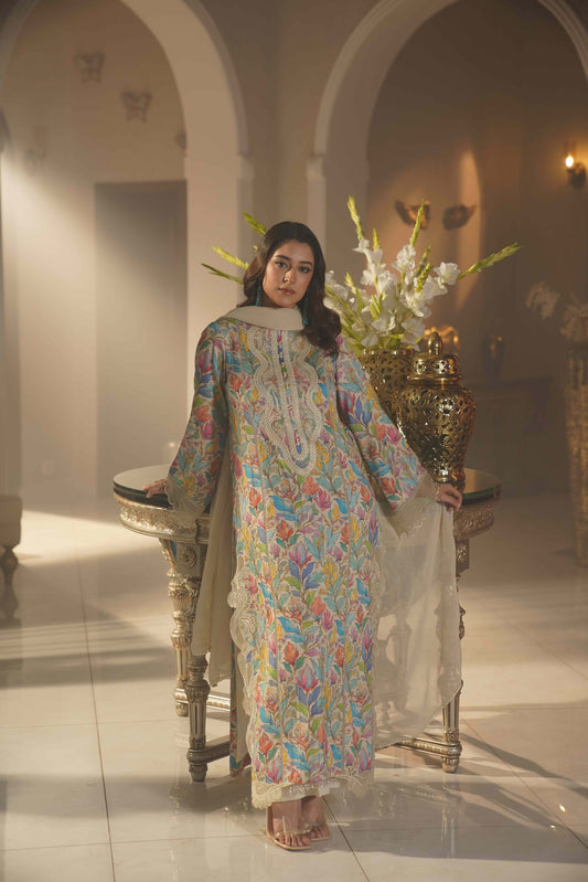 Step into a world where tradition meets contemporary charm. This beautifully detailed ensemble is designed to reflect poise, confidence, and effortless grace. The soft neutral base adorned with vibrant floral artistry creates a refined look that transitions seamlessly from intimate gatherings to festive evenings.