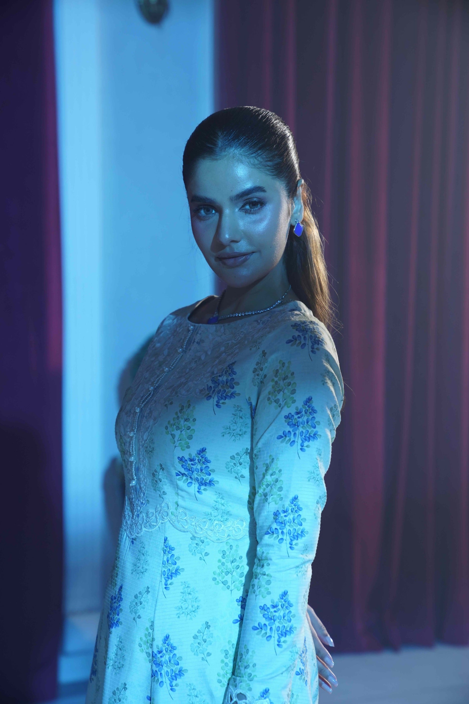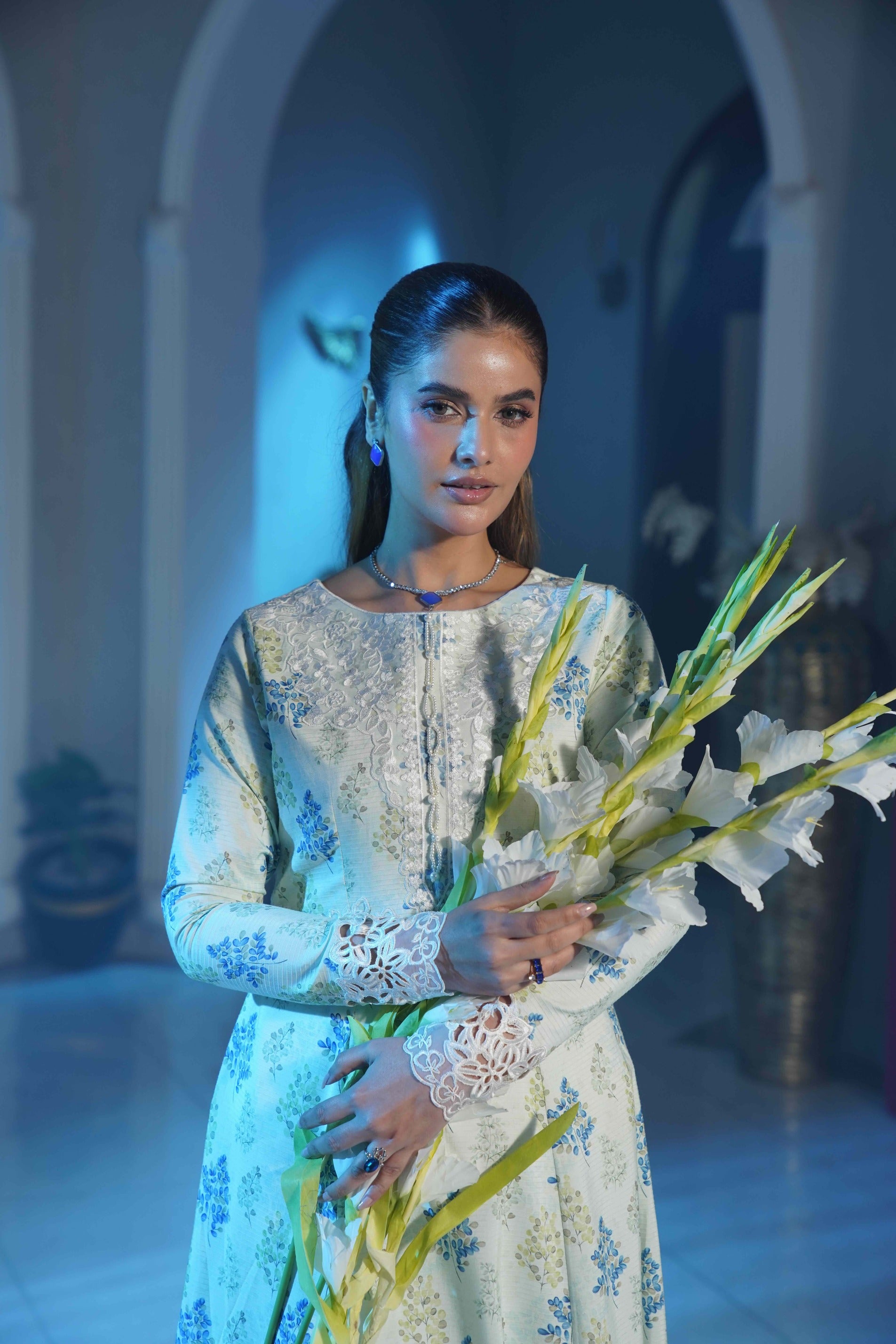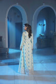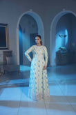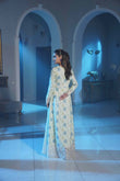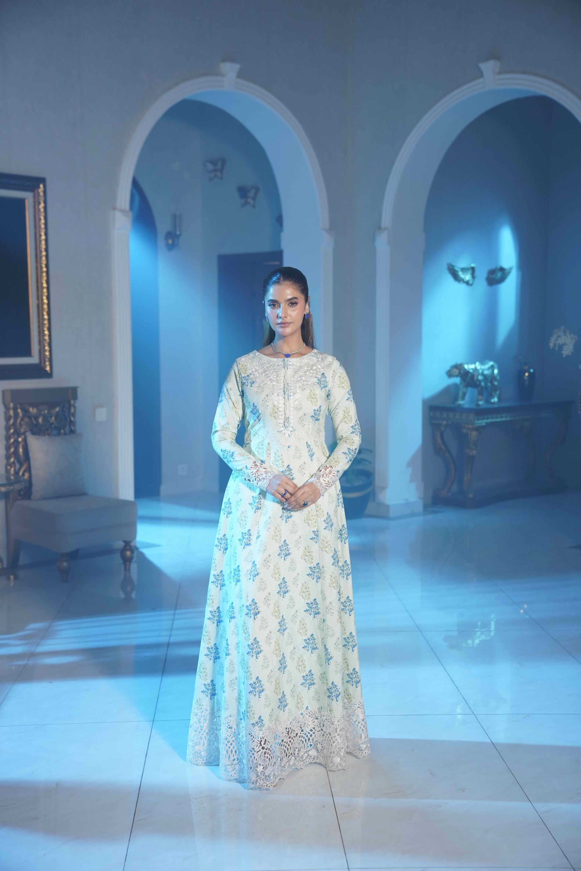 This graceful ivory long dress features delicate blue floral motifs spread elegantly across the fabric, creating a soft and sophisticated look. The intricately embroidered neckline and detailed lace hem add a refined, luxurious touch, while the full-length flowing silhouette enhances its timeless charm. Perfect for formal gatherings, evening events, and festive occasions.