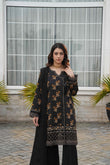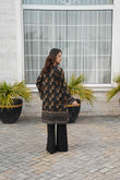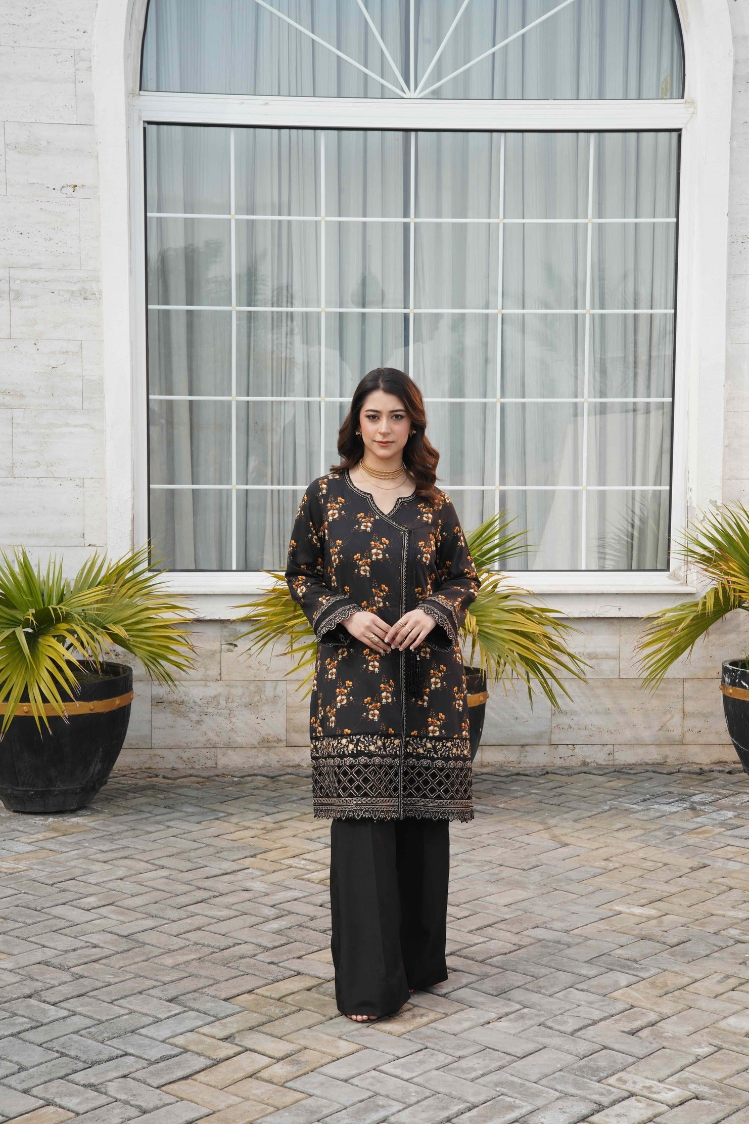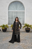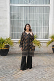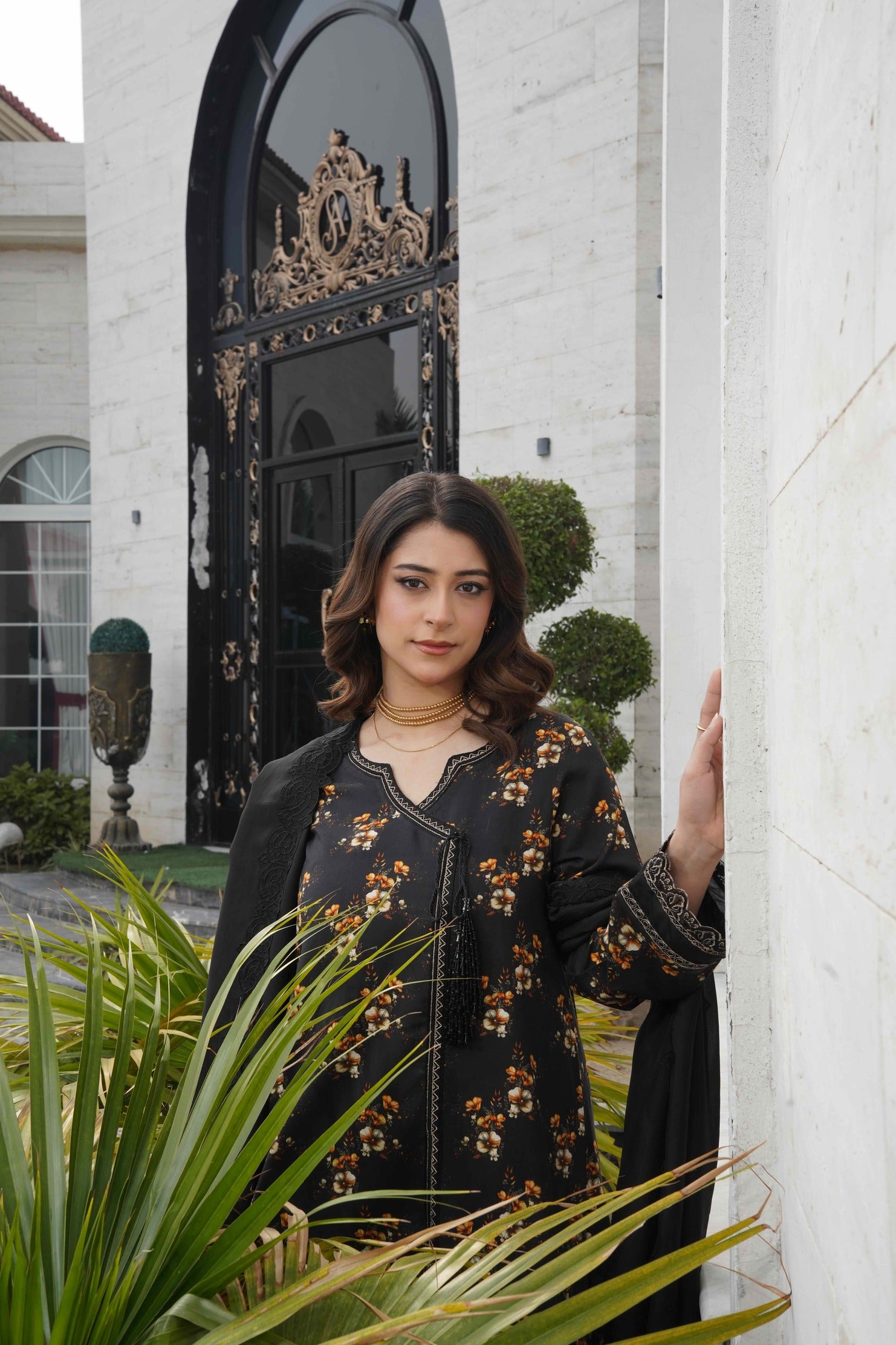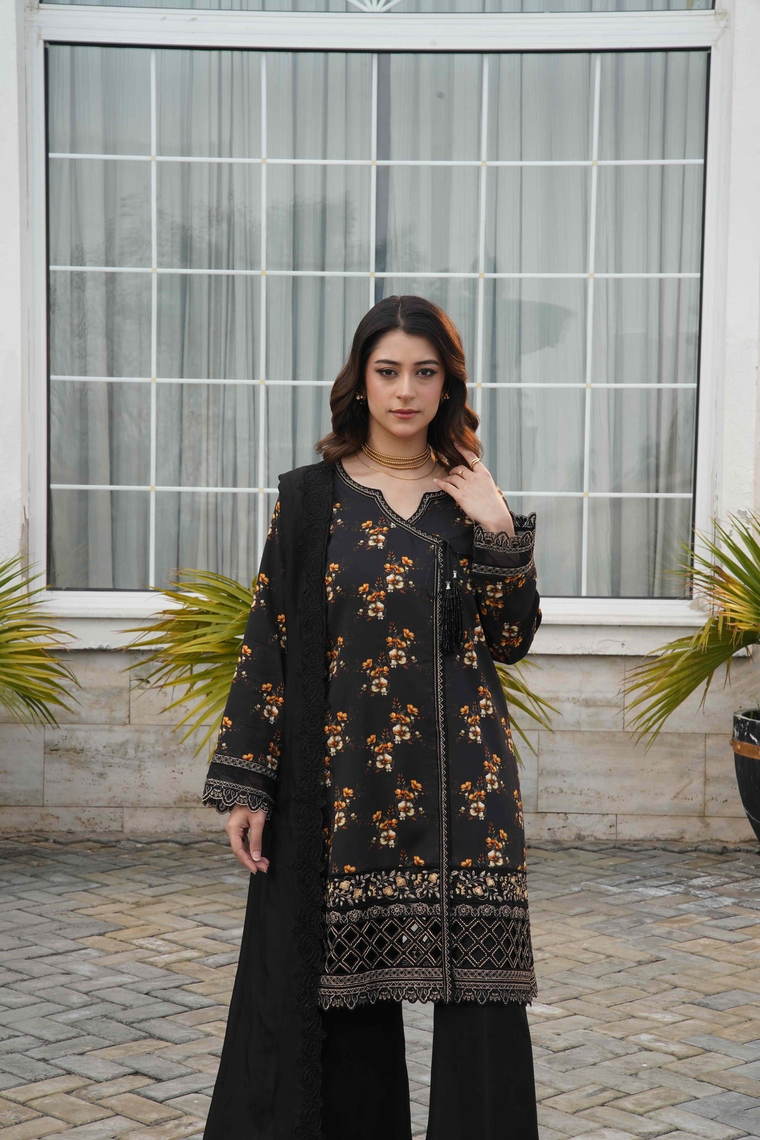 This sophisticated black 3-piece ensemble beautifully blends classic elegance with modern charm. The deep black base is enhanced with delicate floral prints, while the intricately embroidered hem and sleeve borders add a refined, luxurious touch. Paired with wide-leg trousers and a matching dupatta, this outfit is perfect for evening gatherings and semi-formal occasions.