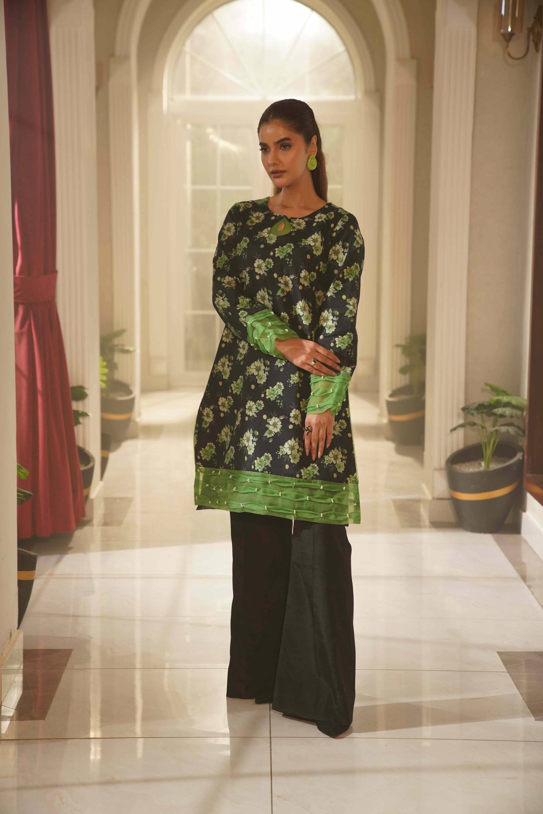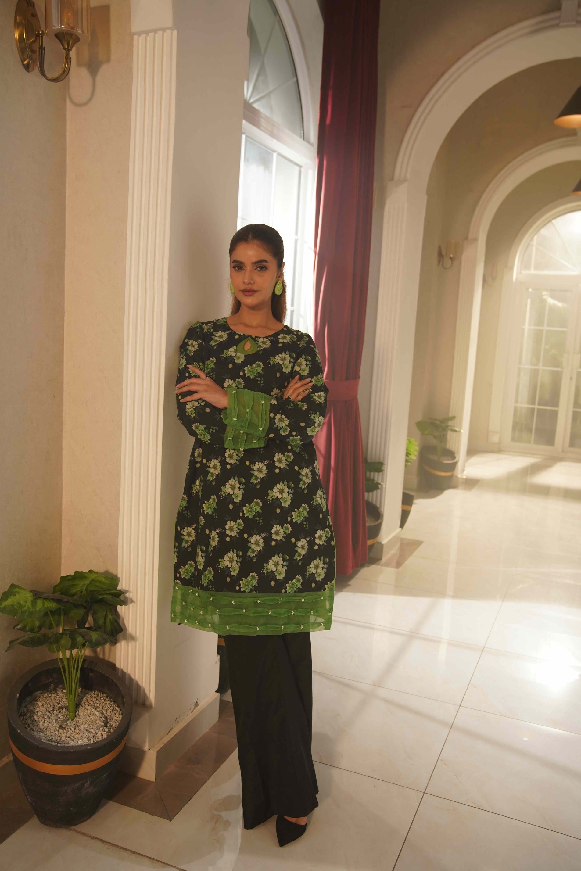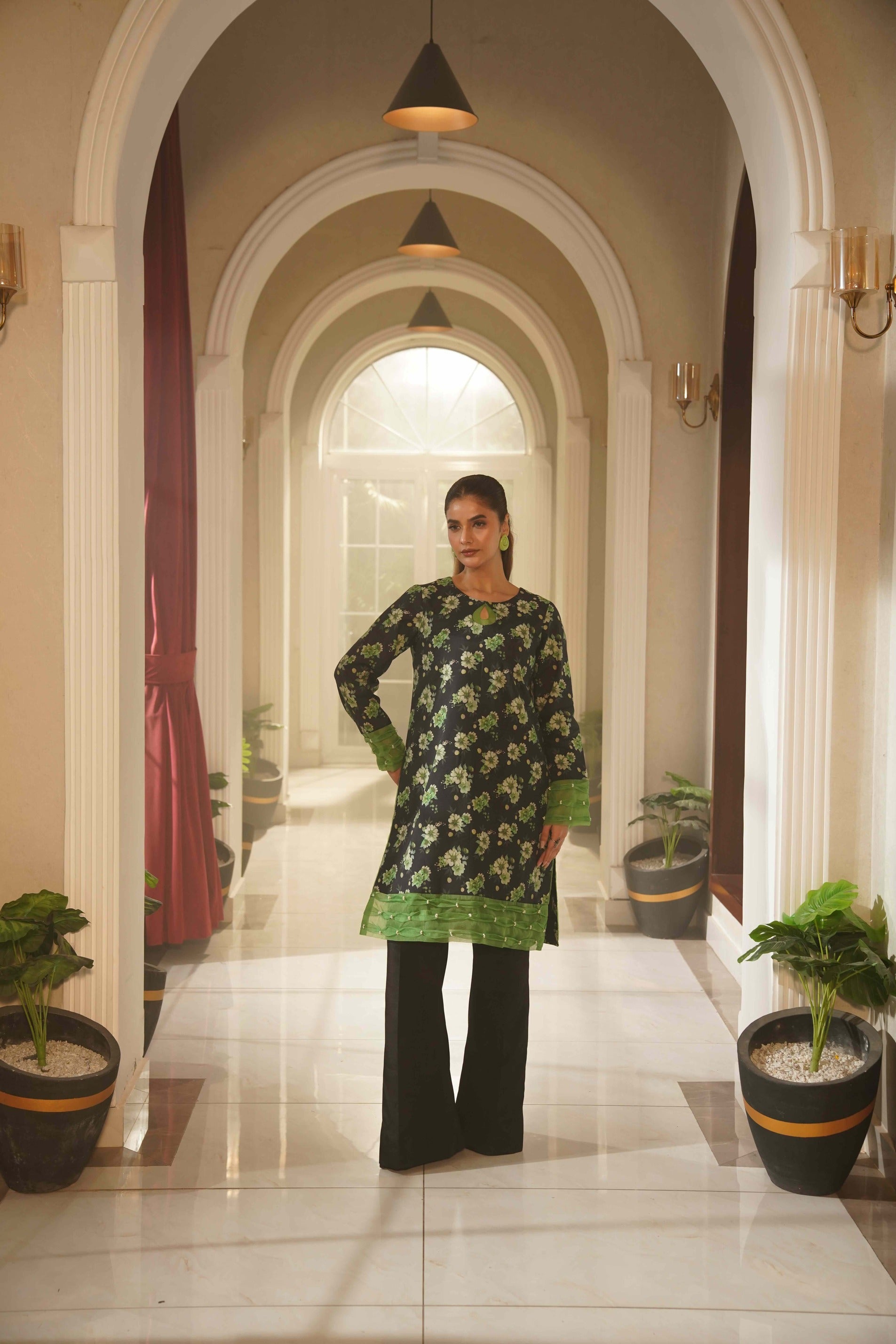 This striking black ensemble is beautifully adorned with rich golden floral prints, creating a bold yet elegant statement. The scalloped neckline and lace-detailed sleeves add a refined touch, while the flowing matching dupatta enhances its graceful appeal. Paired with printed wide-leg trousers featuring a delicate lace layer, this outfit is perfect for festive occasions and evening events.