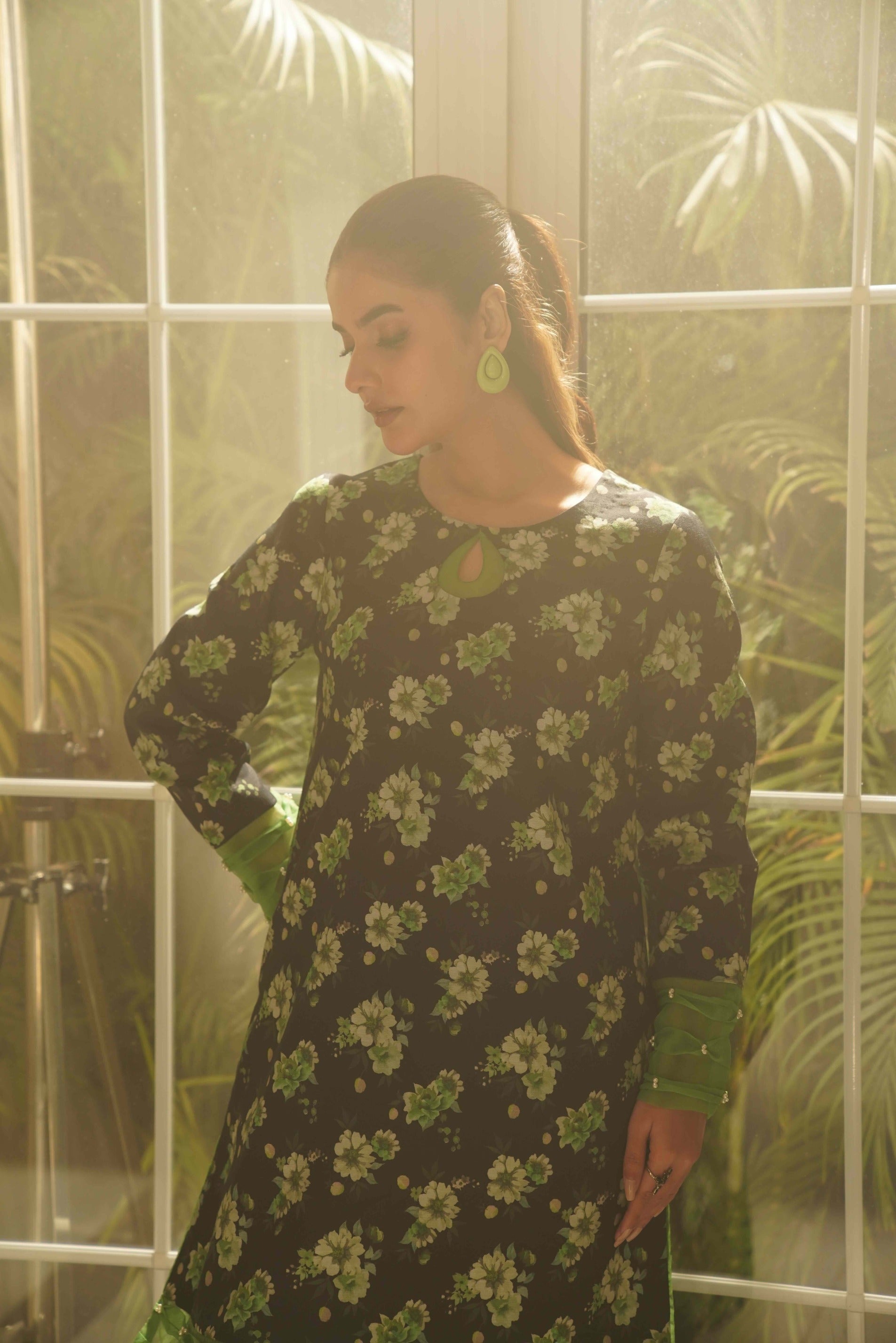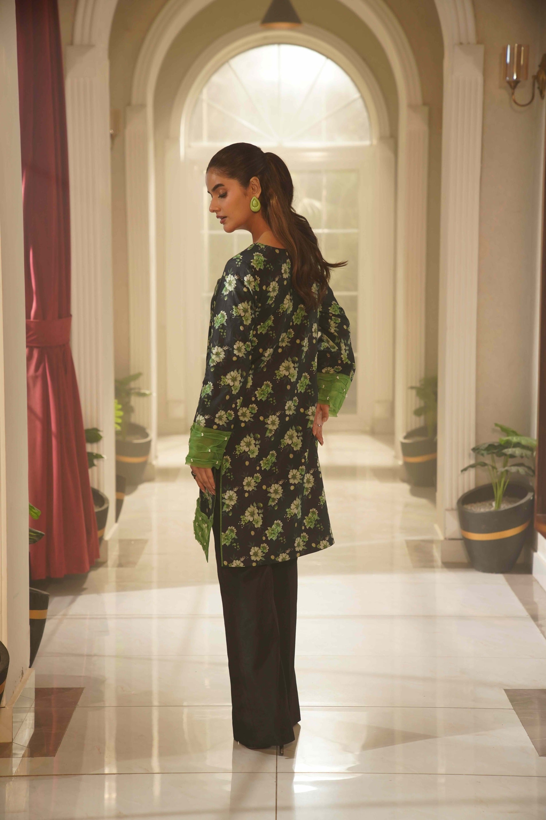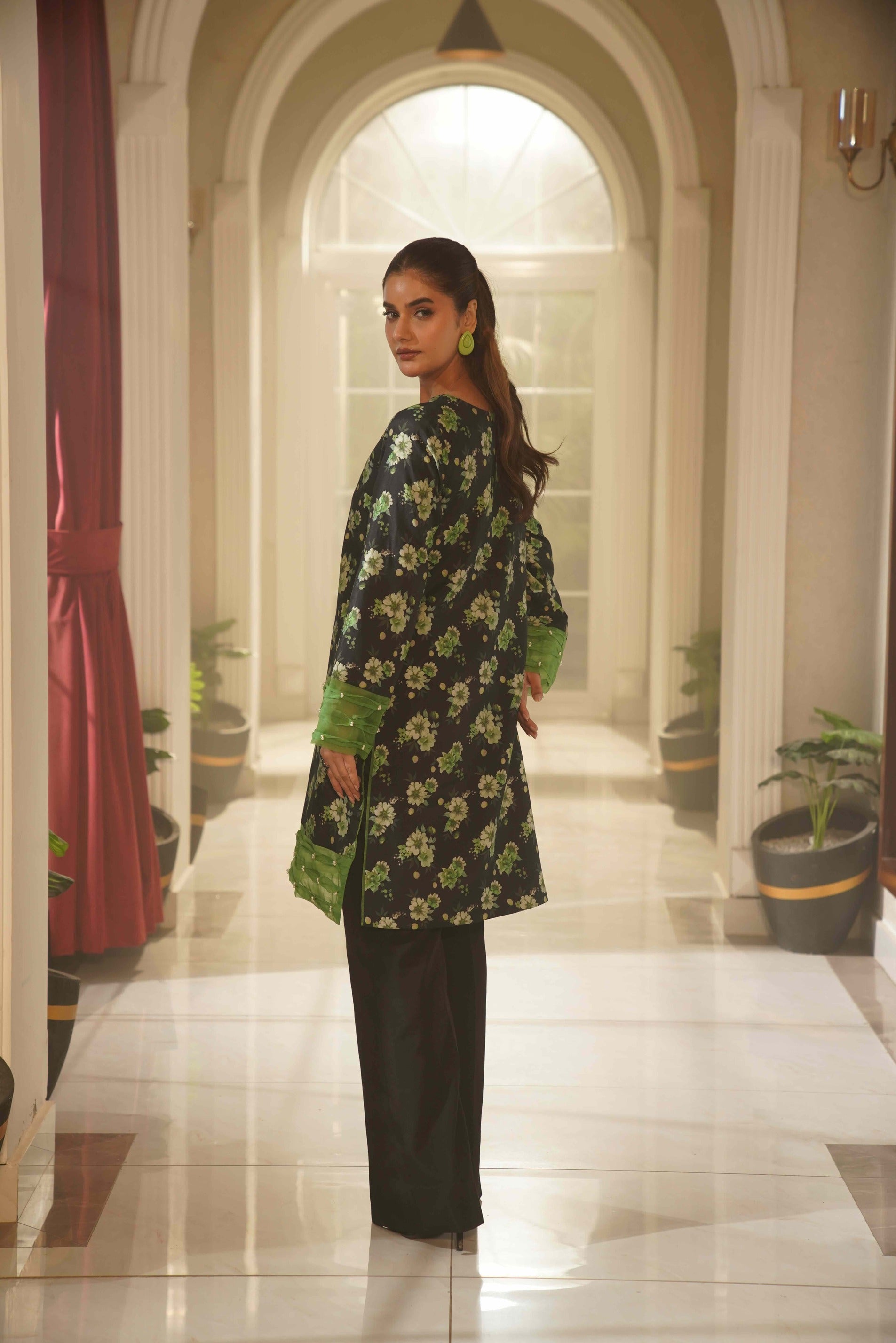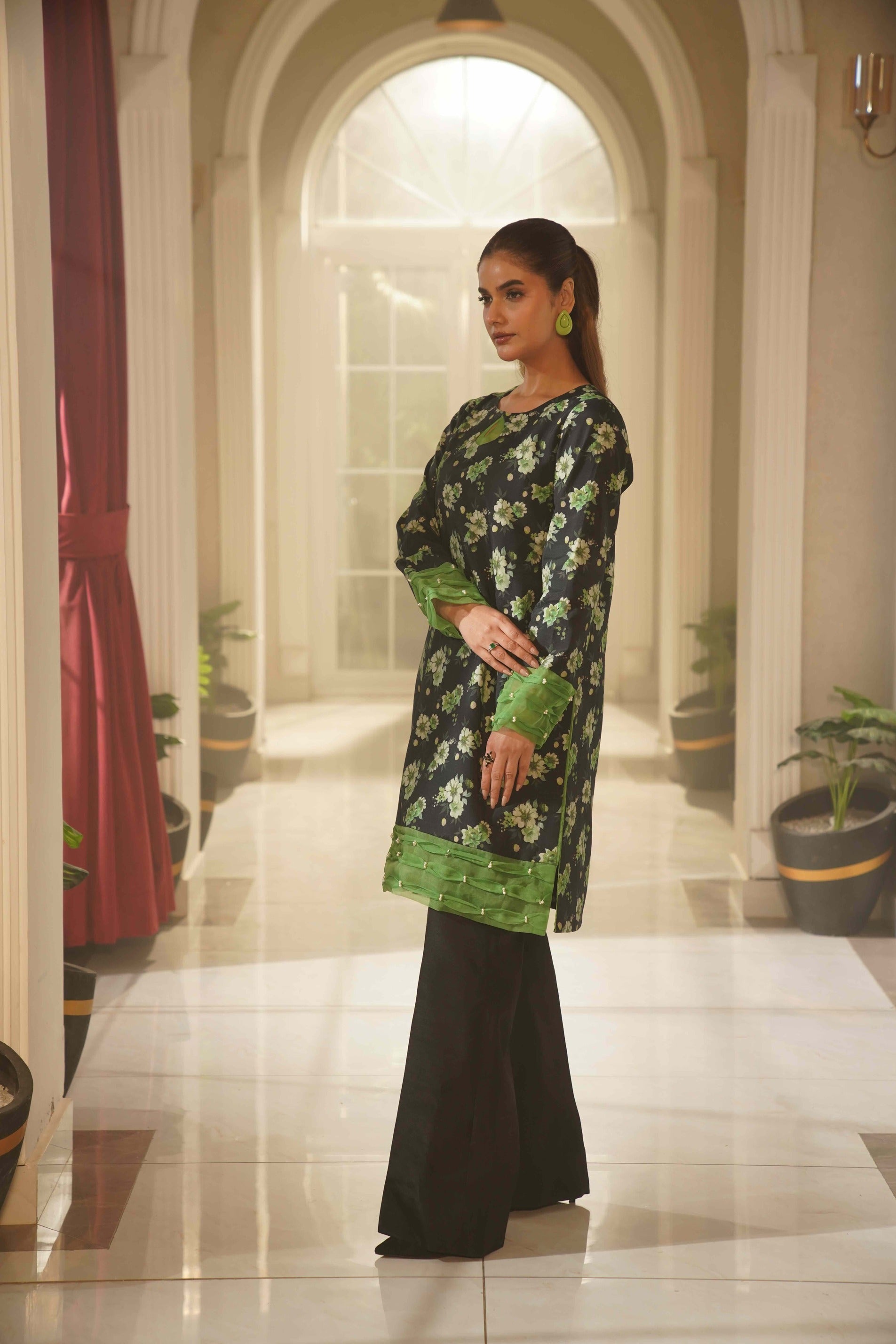 This striking black ensemble is beautifully adorned with rich golden floral prints, creating a bold yet elegant statement. The scalloped neckline and lace-detailed sleeves add a refined touch, while the flowing matching dupatta enhances its graceful appeal. Paired with printed wide-leg trousers featuring a delicate lace layer, this outfit is perfect for festive occasions and evening events.